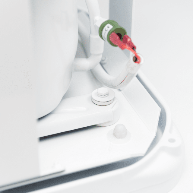 This titanium condenser has a square chassis for easy installation, while the reversing valve, pressure switches, and service ports are all centrally located for convenient maintenance access. Vibration-isolating compressor mounting system reduces noise and vibration. Pair this condenser with a Dometic Emerald TurboVap R-410A evaporator.