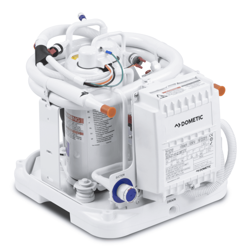 This titanium condenser has a square chassis for easy installation, while the reversing valve, pressure switches, and service ports are all centrally located for convenient maintenance access. Vibration-isolating compressor mounting system reduces noise and vibration. Pair this condenser with a Dometic Emerald TurboVap R-410A evaporator.
